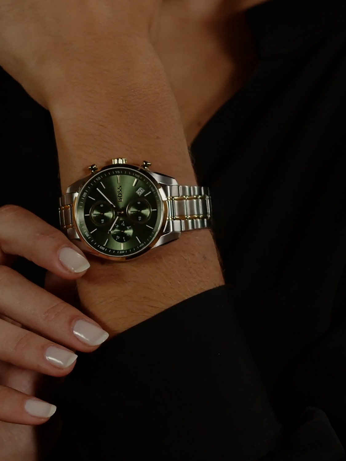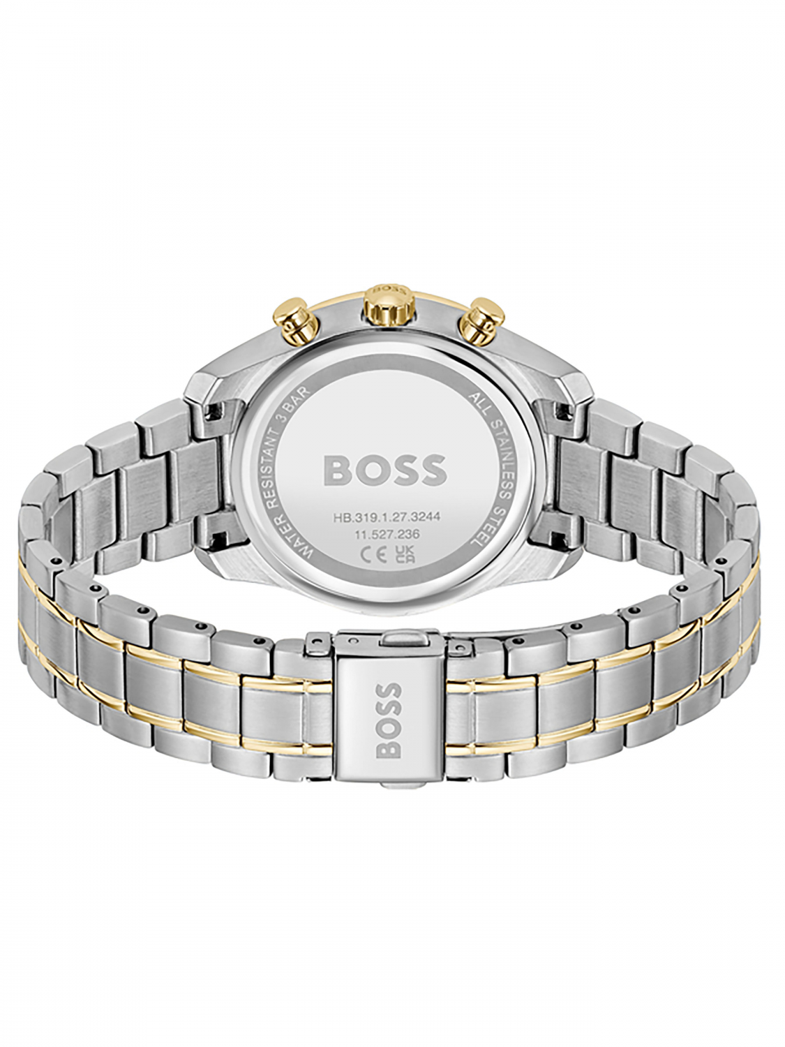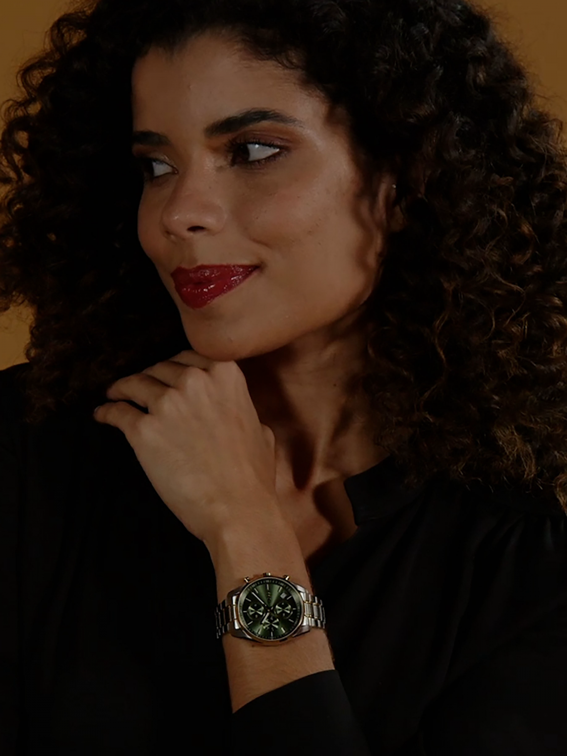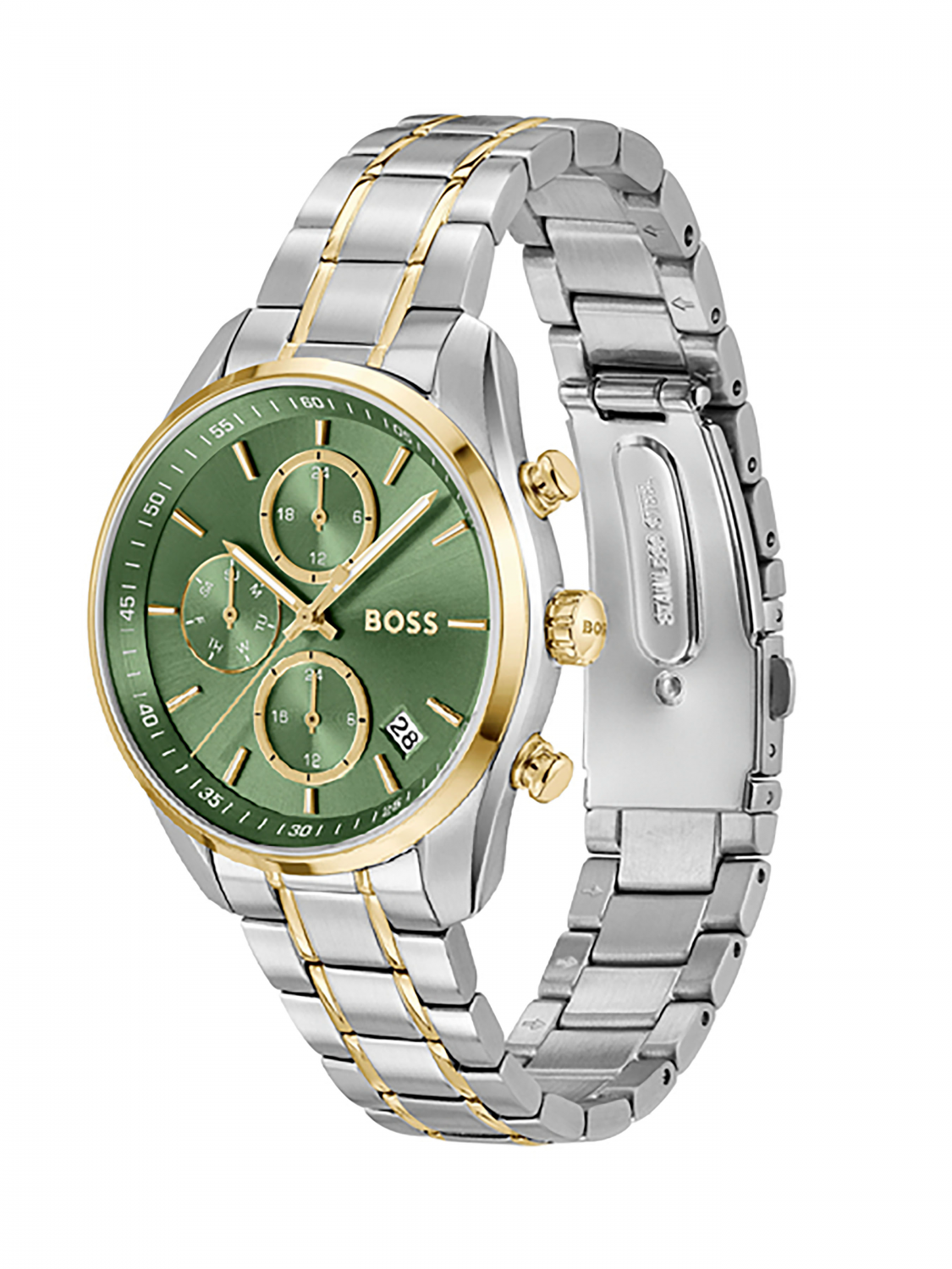 Часы Boss 1502766. Их изысканный двухцветный корпус и зеленый циферблат с функцией хронографа идеально подойдут для современных женщин.