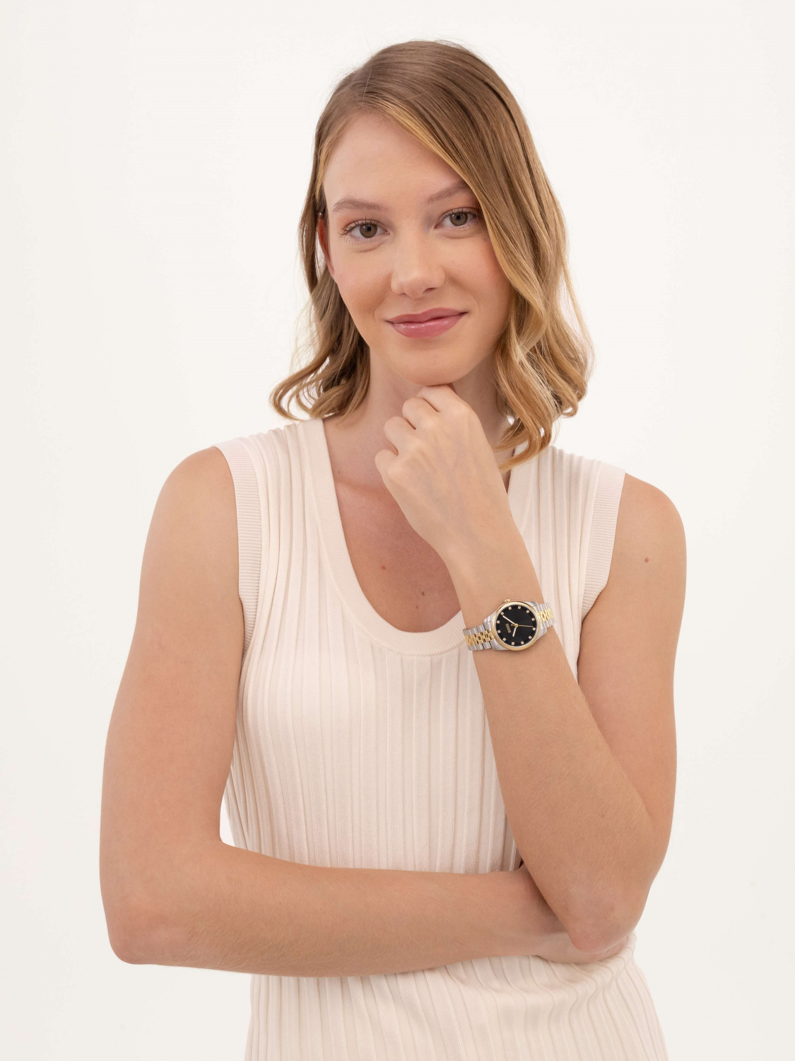 Корпус и браслет часов из нержавеющей стали с частичным PVD покрытием. Циферблат с минеральным стеклом устойчивым к появлению царапин.