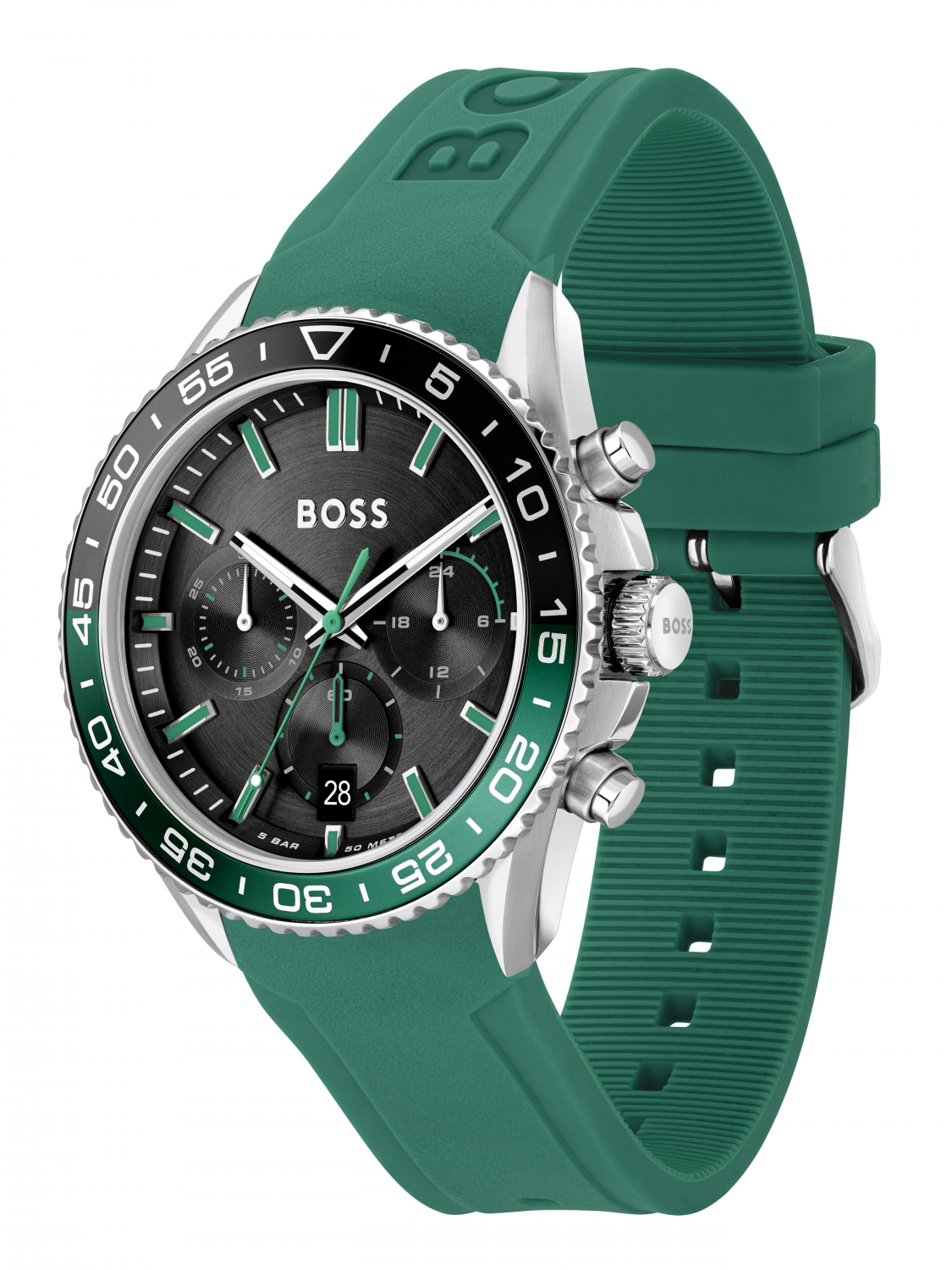 Корпус часов выполнен из нержавеющей стали. Функции: хронограф, дата. Диаметр 44 мм. Силиконовый ремешок с классической застёжкой. Водозащита 5 bar.