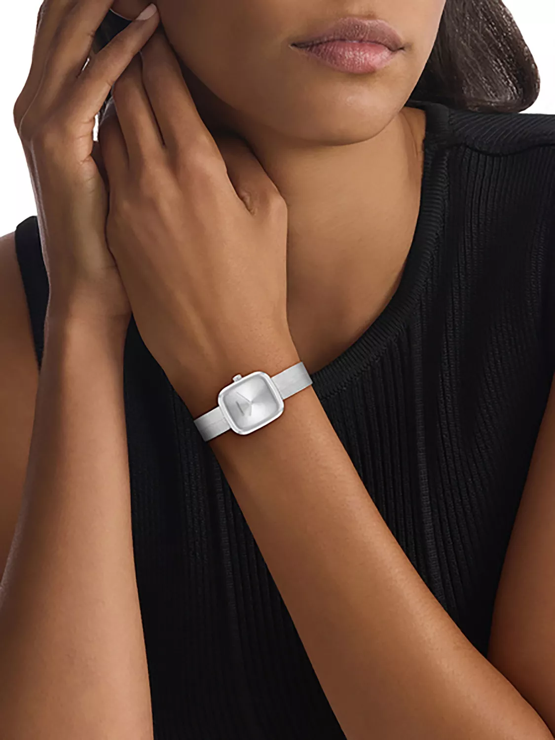 Серебристый циферблат защищен минеральным стеклом, которое устойчиво к мелким повреждениям и царапинам.