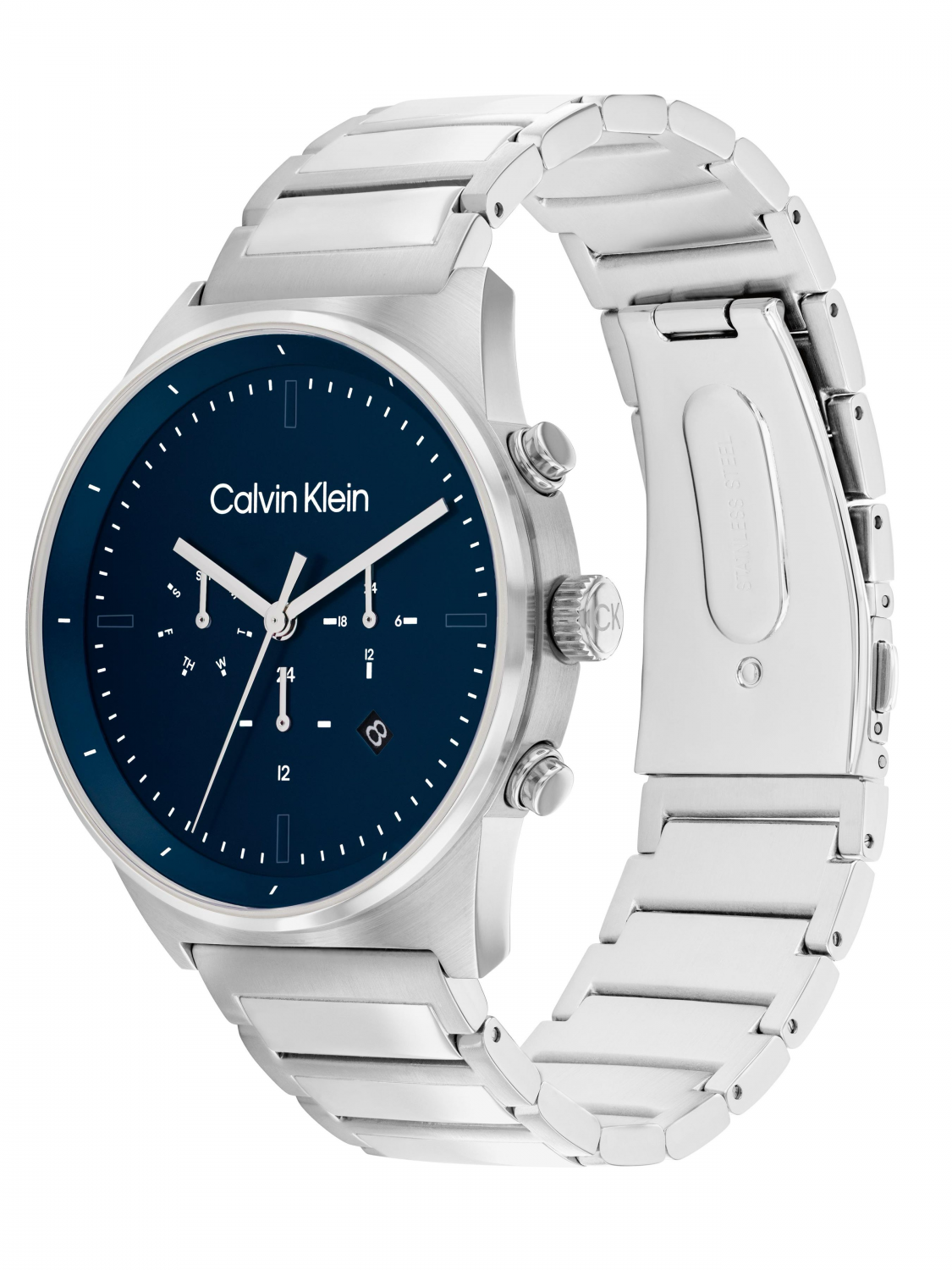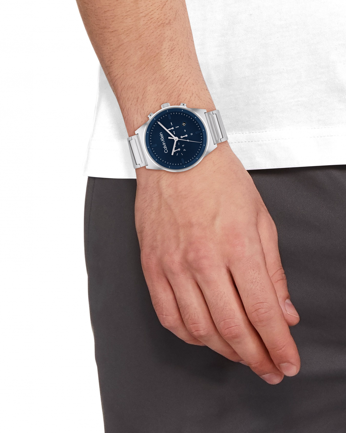 Calvin Klein 25200293 (известные также как серия Impressive или Sculptural) — это стильные мужские кварцевые наручные часы, выполненные в классическом минималистичном дизайне бренда. Мультифункциональный циферблат тёмно-синего цвета с аналоговой индикацией, с отображением даты, дня недели и дополнительной 24-часовой шкалой. Вместо цифр используются лаконичные штрихи-метки. Защищён минеральным стеклом. Диаметр циферблата 44 мм.. Корпус и браслет выполнены из нержавеющей стали. Водонепроницаемость 5 ATM (50 метров) — часы выдерживают брызги и дождь.