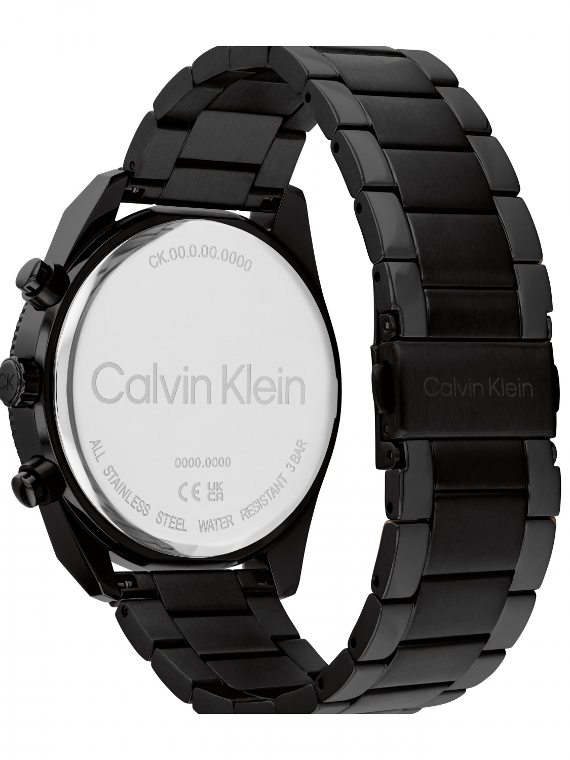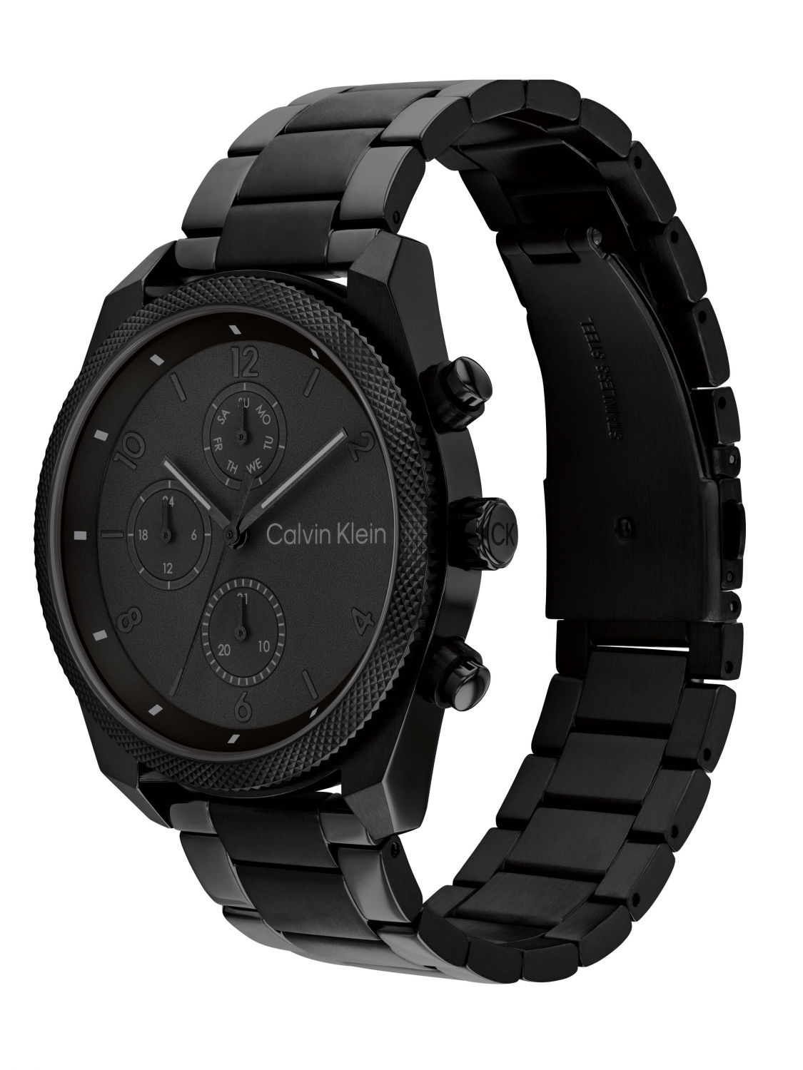Мужские кварцевые наручные часы Calvin Klein 25200359  с черным ионным напылением, которые сочетают в себе эстетику минимализма и практичность.Коллекция Impact. Круглый корпус диаметром 44 мм и браслет изготовлены из высококачественной нержавеющей стали. Особенностью дизайна являются индустриальный безель с накаткой и утопленные индексы. Матовый черный циферблат с люминесцентными стрелками и тремя дополнительными субциферблатами (индикация даты, дня недели и 24-часового формата). Минеральное стекло. Стальной браслет с раскладывающейся застежкой (клипсой). Водонепроницаемость 3 ATM (30 метров). Часы выдерживают случайные брызги или дождь, но не предназначены для плавания или принятия душа.