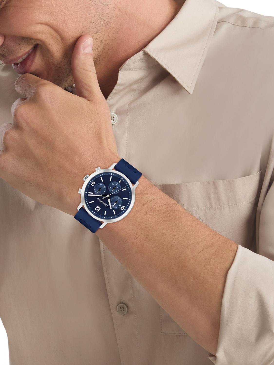 Часы Calvin Klein Gauge 25200460 — это мужская кварцевая мультифункциональная модель, сочетающая спортивный стиль и фирменный минимализм бренда. Темно-синий круглый циферблат с серебристыми стрелками и метками, защищён минеральным стеклом. На нём отображены даты, дня недели и 24-часового формата времени на трех дополнительных субциферблатах. Корпус изготовлен из нержавеющей стали. Диаметр составляет 44 мм.. Синий силиконовый ремешок с классической застежкой-пряжкой, устойчивый к влаге и удобный для повседневной носки. Водонепроницаемость 5 АТМ, выдерживают случайные брызги и дождь, но не предназначены для плавания.