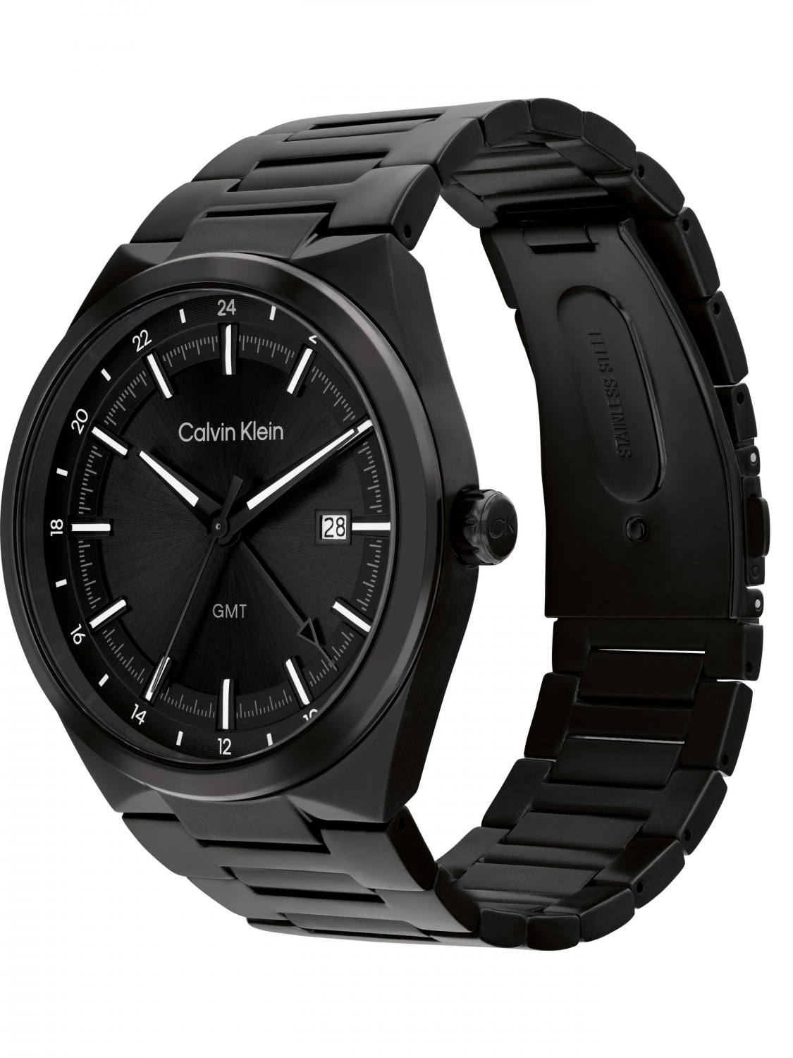 Циферблат черного цвета с серебристыми индексами, с функцией GMT, дополнительная стрелка для второго часового пояса. Защищён минеральным стеклом. Диаметр циферблата составляет 44 мм.. Корпус и браслет выполнены из нержавеющей стали с черным IP-покрытием, с раскладывающейся застежкой (бабочка) и кнопками фиксации.