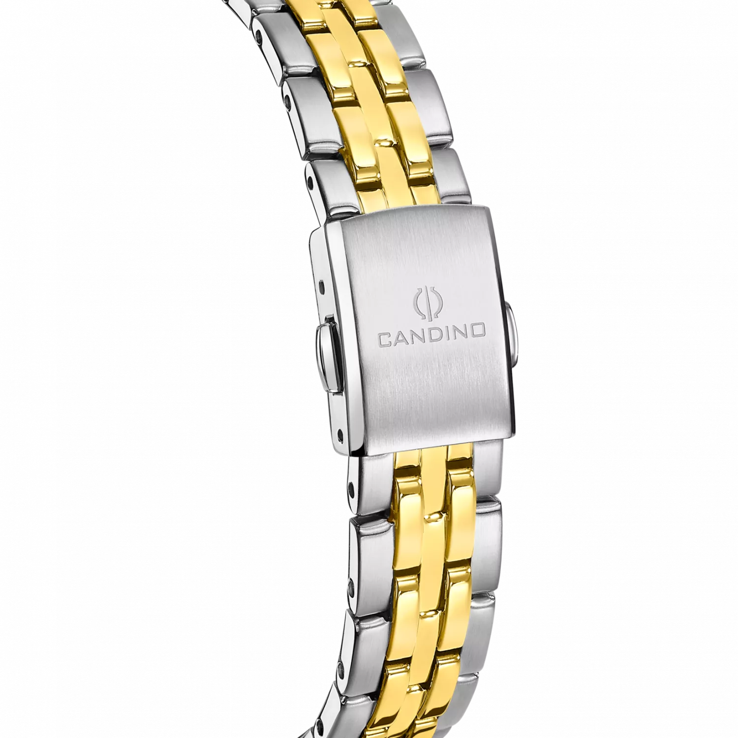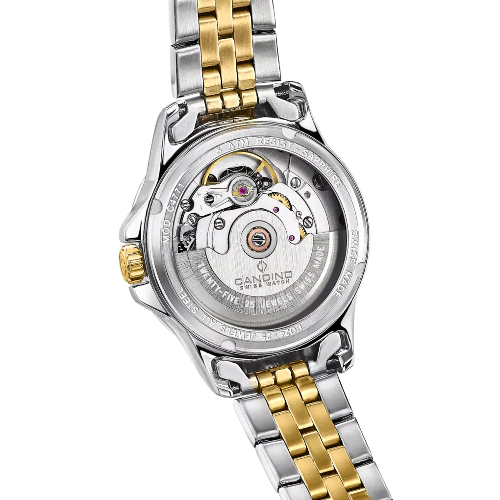 Женские механические наручные часы с автоподзаводом Candino Automatic Ladies. Корпус и браслет часов изготовлены из нержавеющей стали. Сапфировое стекло повышенной прозрачности, устойчивое к мелким механическим повреждениям. Стальной браслет с частичным PVD-покрытием на раскладной застёжке. Стрелки с люминесцентным покрытием. Циферблат инкрустирован кристаллами. Класс водозащиты: 50 метров, позволит защитить корпус от случайных брызг или капель дождя. Окошко даты находится в положении 3 часа.