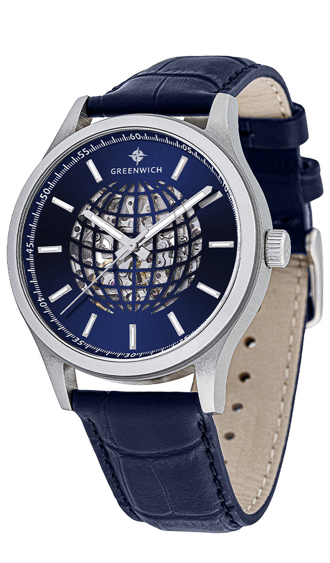 Часы-скелетон  - это само по себе произведение часового искусства. А в серии Globe прозрачный циферблат украшает оригинальный элемент, линии параллелей и меридианов которого складываются в очертания глобуса. Задняя крышка модели тоже прозрачная, сквозь нее можно наблюдать за движениями ротора с традиционной уже для бренда гравировкой Good Luck и других деталей автоматического механизма Miyota.  На пластине синего цвета закреплены накладные риски. Часовая и минутная стрелки выделены люминесцентным покрытием, которое обладает способностью светиться в темноте. Водостойкость часов Globe равна 10 атмосферам. Корпус модели сделан из нержавеющей стали, ремешок — из натуральной кожи синего цвета. Стальная застежка и удобная заводная головка декорированы логотипом бренда Greenwich.