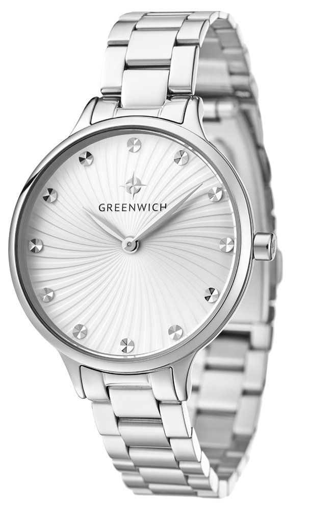 Рельефные лучи, расходящиеся из центра белого циферблата, создают впечатление вихря. А серебристые накладные индексы, имеющие множество граней, хорошо отражают свет — это позволяет точно определить время.