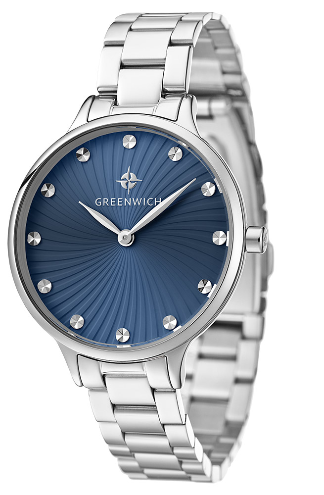 Рельефные лучи, расходящиеся из центра синего циферблата, создают впечатление вихря. А серебристые накладные индексы, имеющие множество граней, хорошо отражают свет — это позволяет точно определить время.