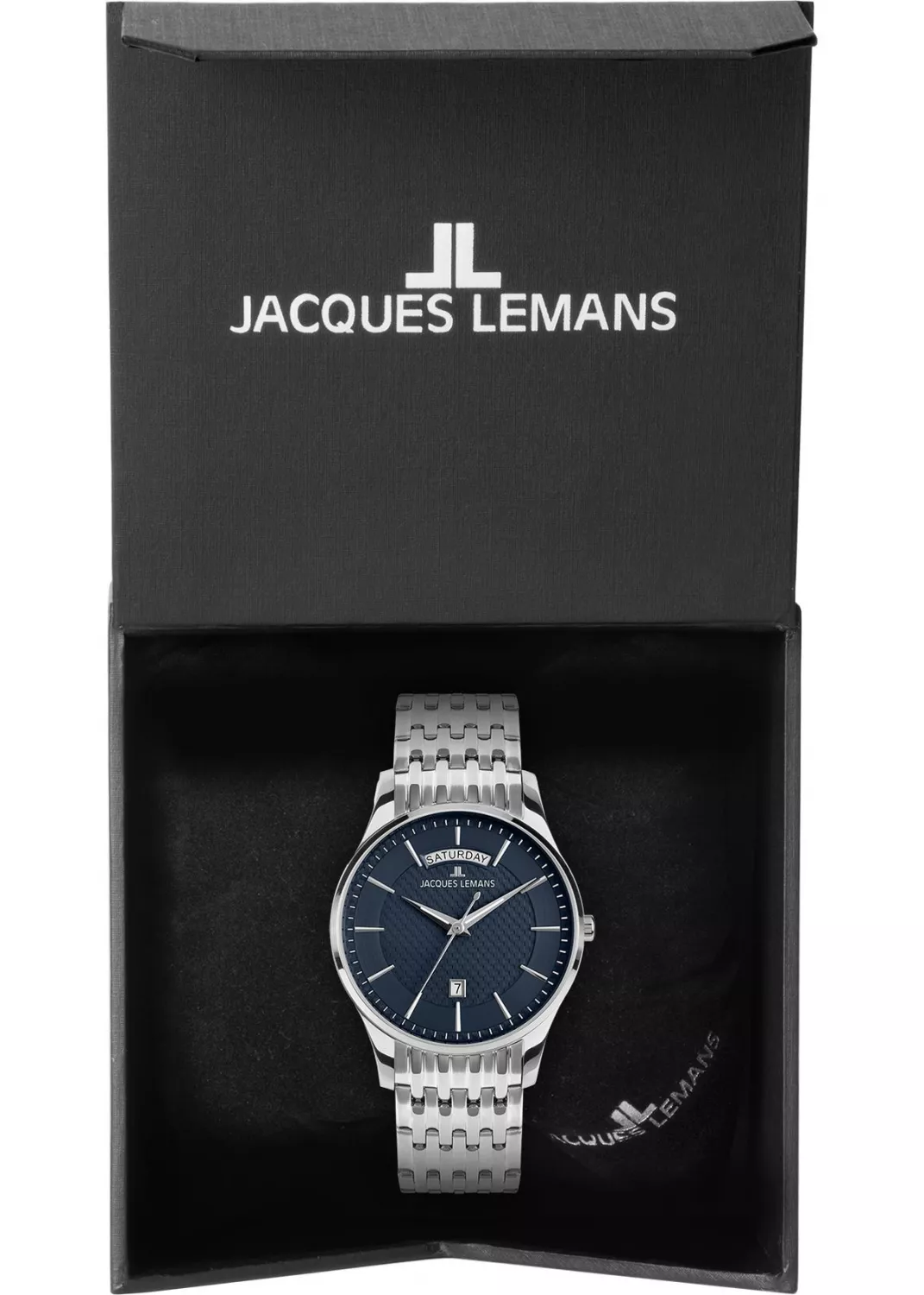 Мужские кварцевые часы London. Круглый стальной корпус. Ударопрочное минеральное стекло Crystex. Двухуровневый циферблат украшен объемным узором. Накладные метки в виде штрихов. Cтрелки с люминесцентным покрытием, которое светится в темноте после непродолжительной зарядки на свету. Окошко даты находится в положении 6 часов. Широкое окошко дня недели в положении 12 часов позволяет показывать название дня недели полностью, без сокращений. Надежный стальной браслет с раскладывающейся застежкой.