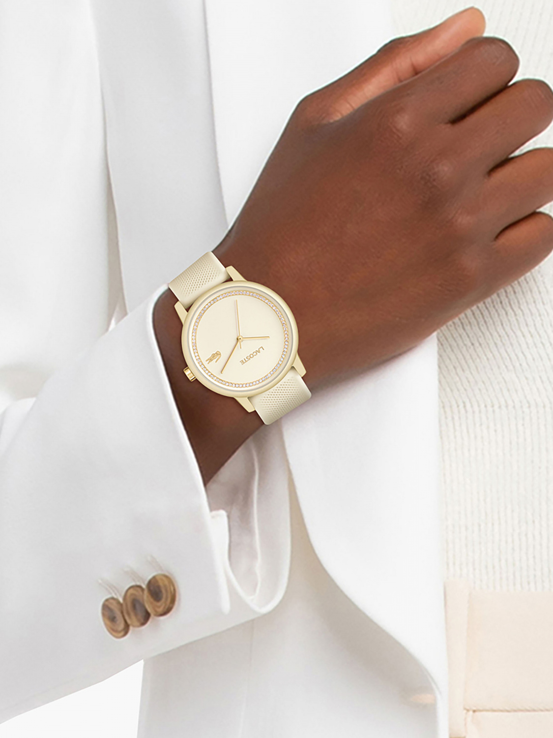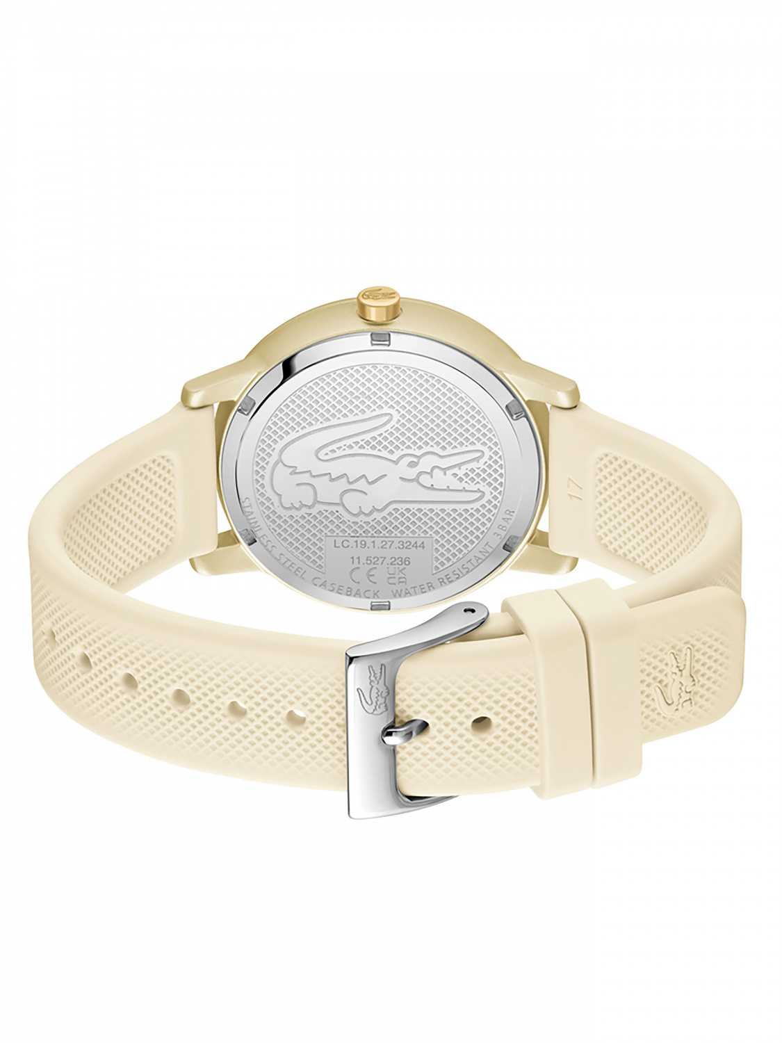 Женские кварцевые часы Lacoste.12.12 Go. Круглый стальной корпус с матовой обработкой. Матовый циферблат без меток украшен фирменным логотипом и кристаллами. Завинчивающаяся задняя крышка. Текстурированный силиконовый ремешок с классической застежкой.