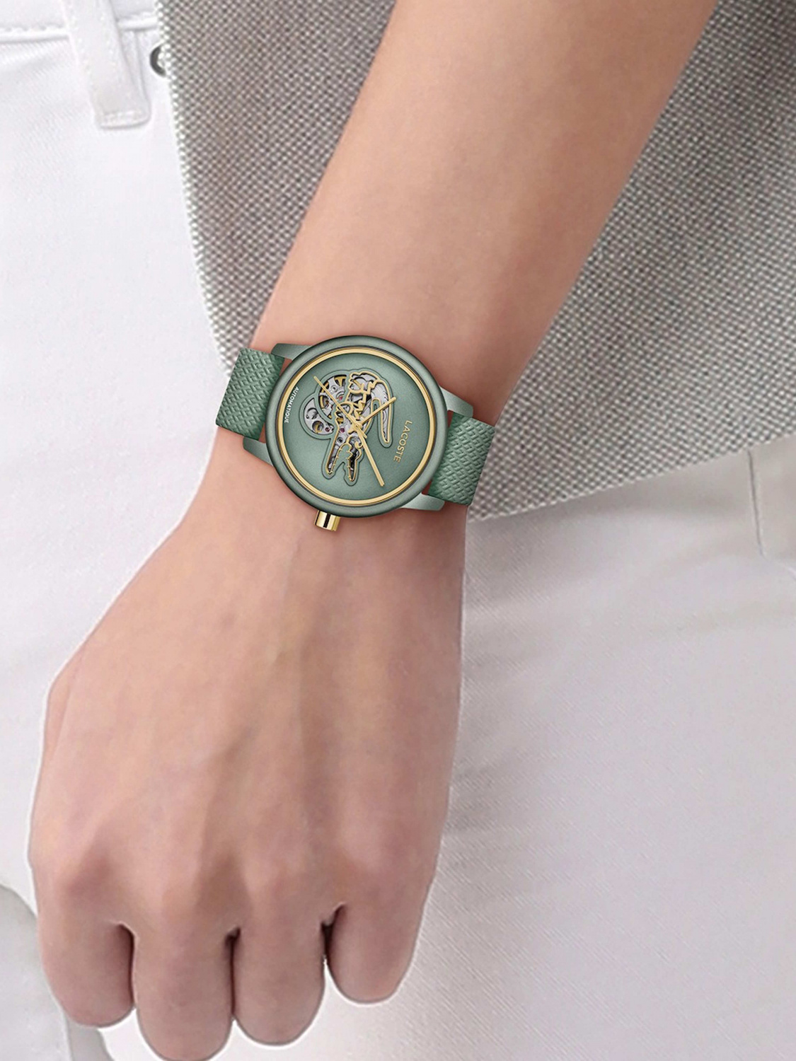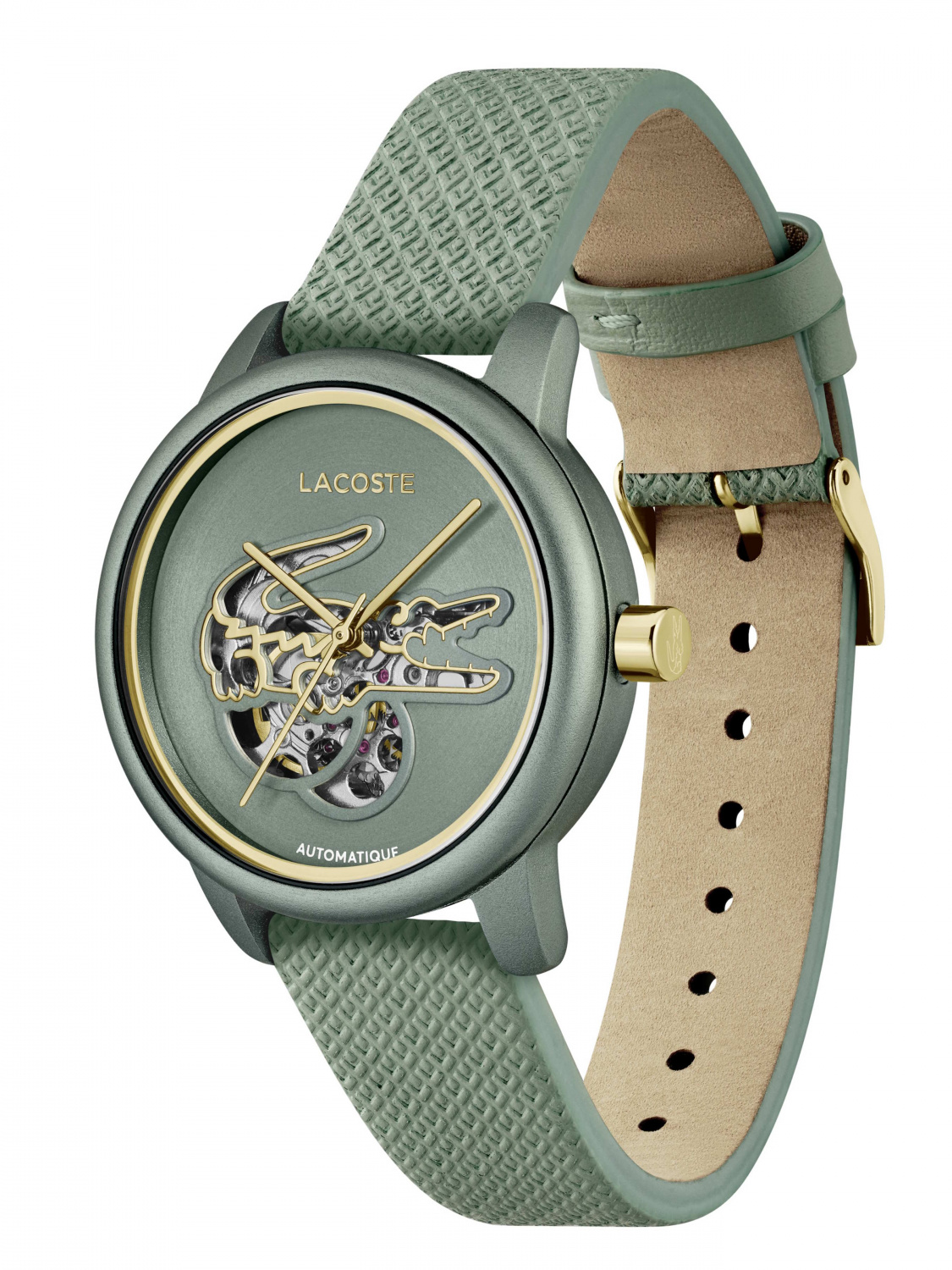 Циферблат: Зеленый, с золотистыми акцентами и «скелетонизированным» вырезом в форме логотипа-крокодила, через который видна работа механизма.