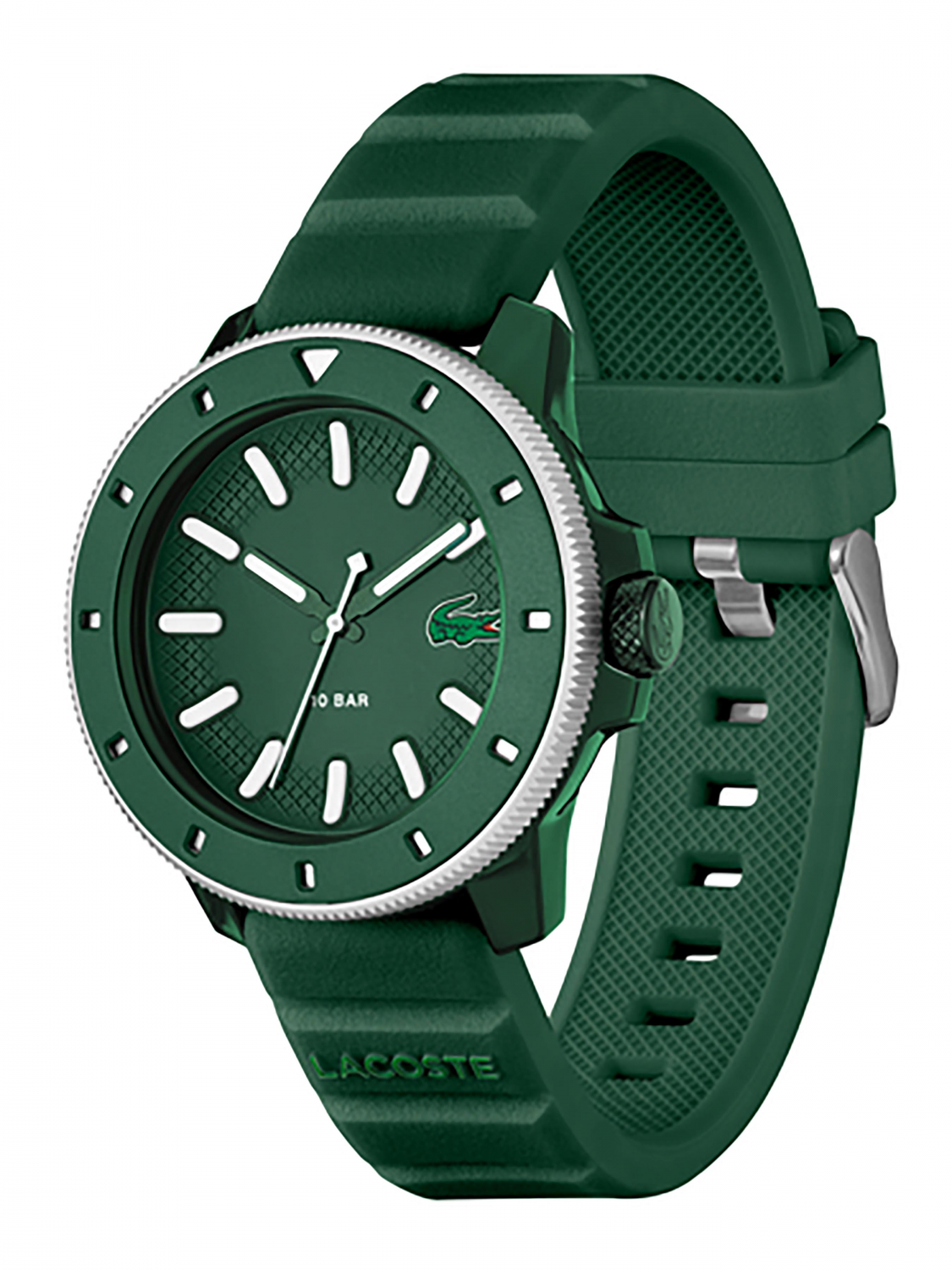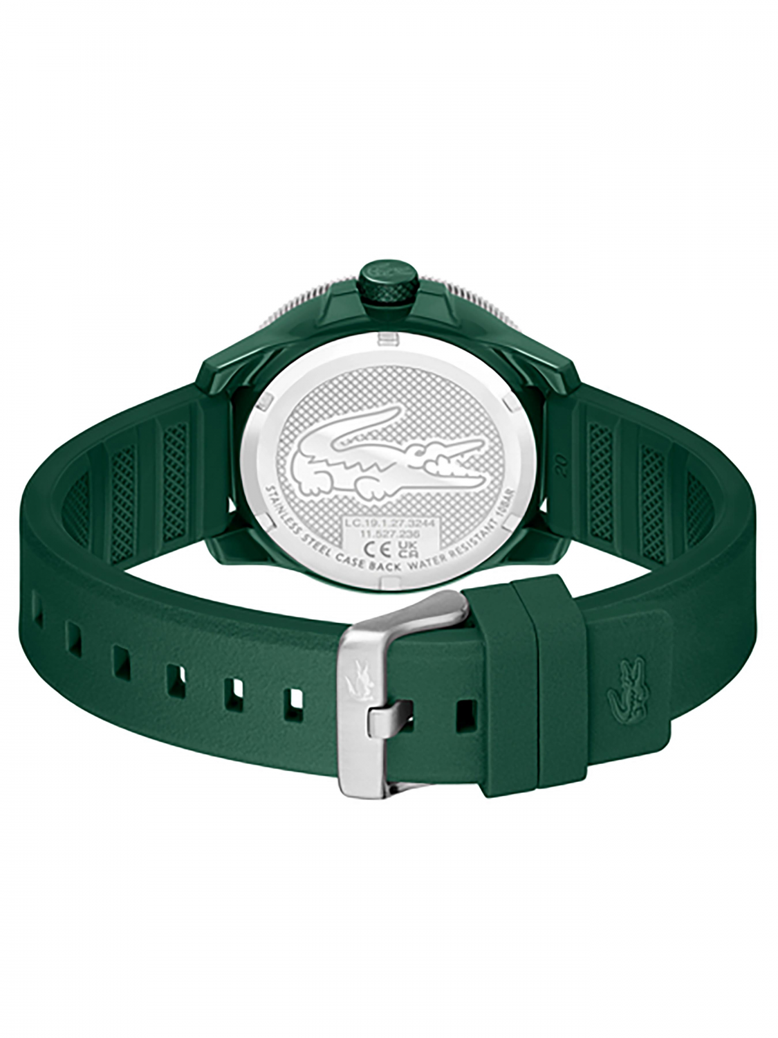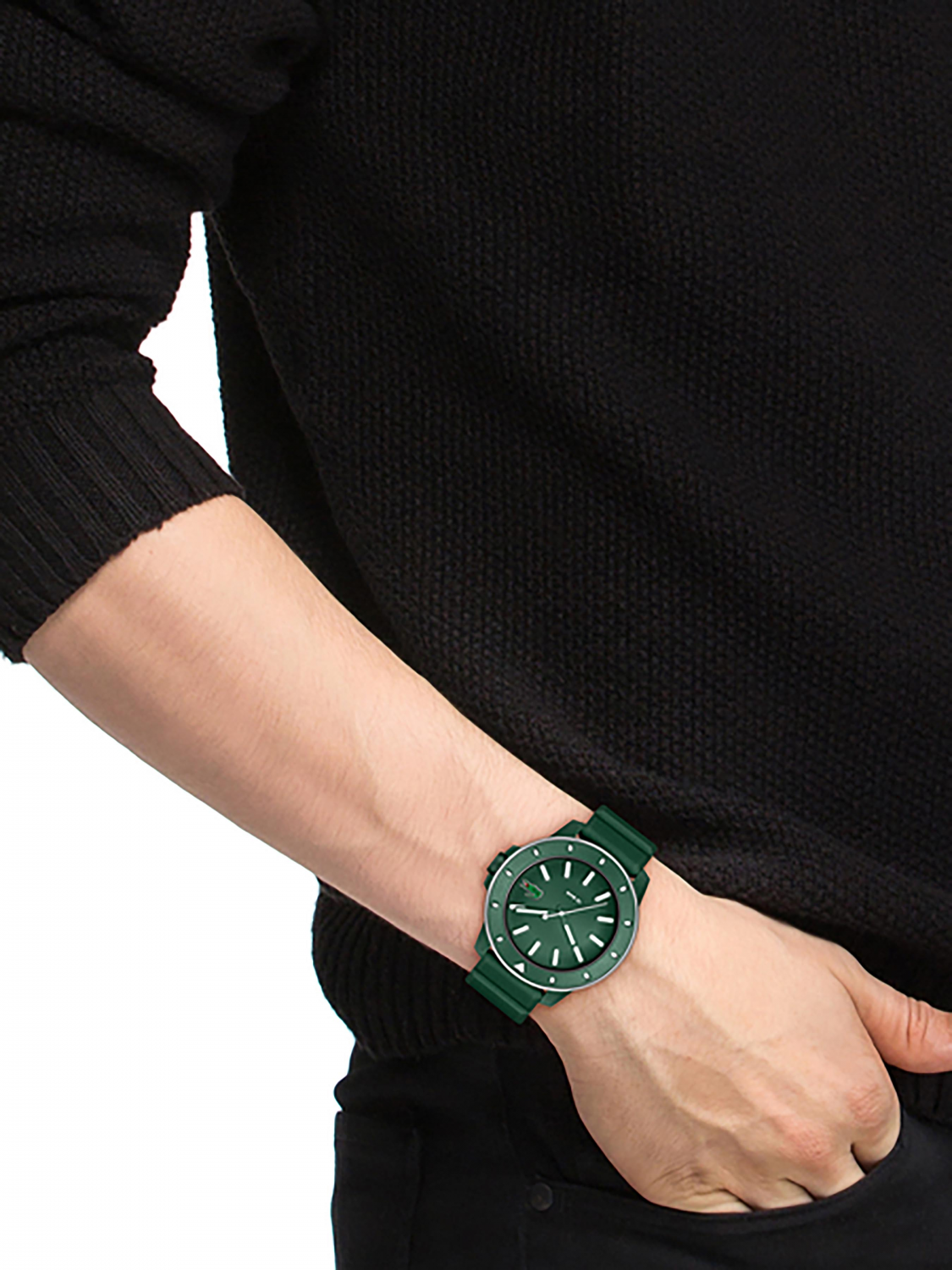 Мужские кварцевые часы LACOSTE.12.12 SCUBA. Круглый пластиковый корпус.Циферблат зеленого цвета защищен минеральным стеклом. Силиконовый ремшок на традиционной застежке. Водонепроницаемость 10 АТМ/bar.