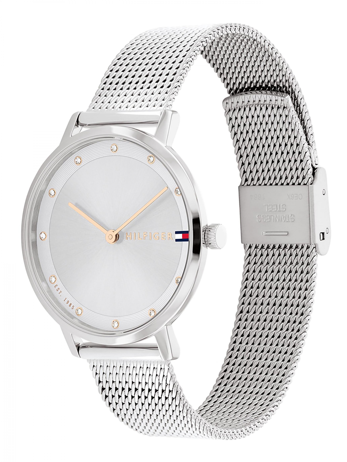 Женские кварцевые часы Tommy Hilfiger.Круглый стальной корпус. Внутри корпуса находится механизм Seiko Instruments Inc.Минеральное стекло.Браслет выполнен из стали,фиксируется на ювелирную застежку.Водозащита 3 АТМ.