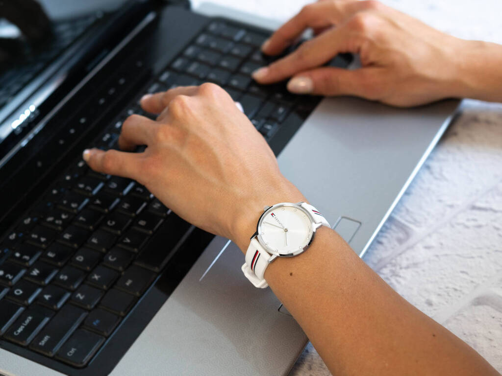 Часы наручные женские кварцевые Tommy Hilfiger  1782735.Серебристые с белым циферблатом.Минеральное стекло.Спортивный,силиконовый ремешок,выполнен в цветовом решении этого бренда.Ремешок на традиционной застежке.Водозащита 5ATM.